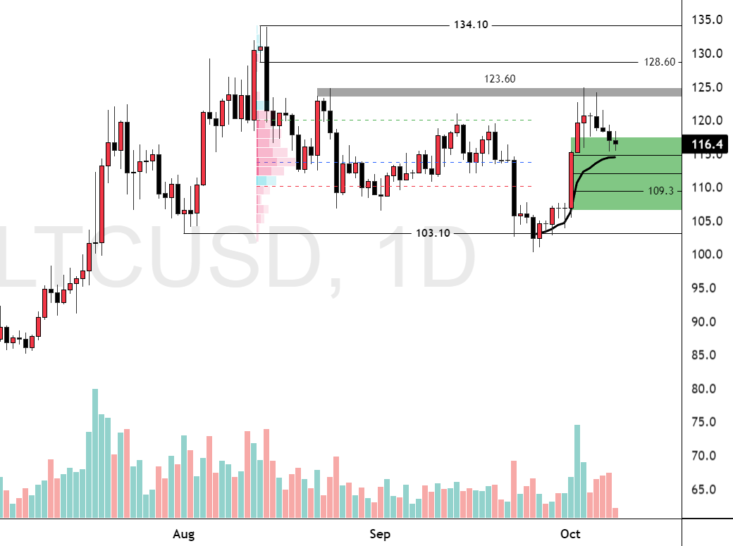 Litecoin is currently at a premium, making it less ideal for new entries. We recommend monitoring the $109.3 support zone, backed by a low volume node, for a better entry. If this level holds, LTC may rally toward $128.60 and $134.10. A break below $109.3 would invalidate the bullish outlook.