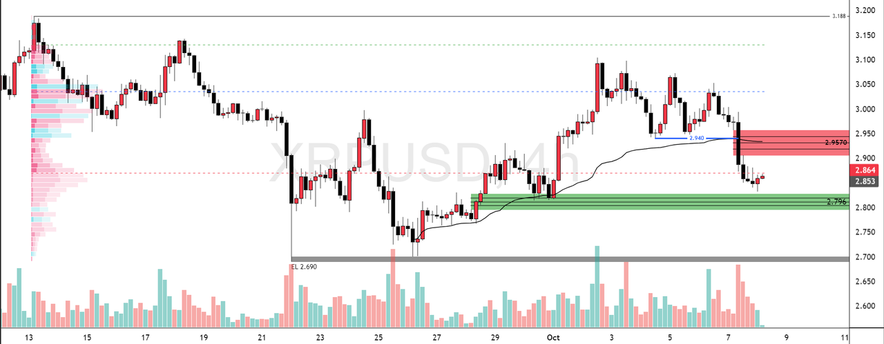 FenzoFx—Ripple (XRP) lost its bullish bias after dipping below $2.940 support, triggering a bearish fair value gap on the 4-hour chart. Selling pressure eased near $2.796 liquidity void, where volume dropped sharply—signaling reduced momentum and potential consolidation.